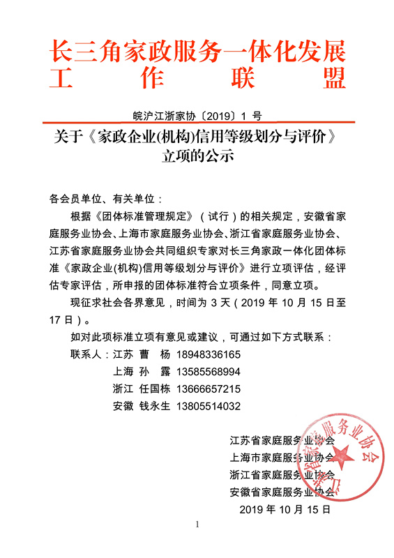 关于《家政企业(机构)信用等级划分与评价》 立项的公示