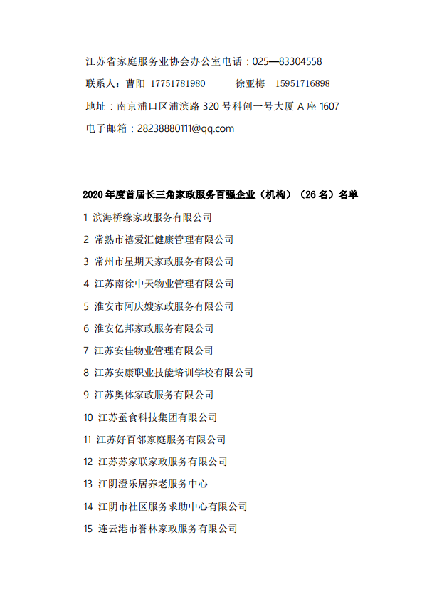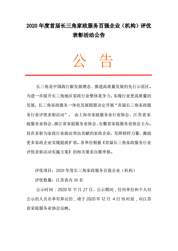 2020 年度首届长三角家政服务百强企业(机构)评优